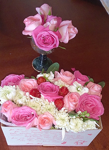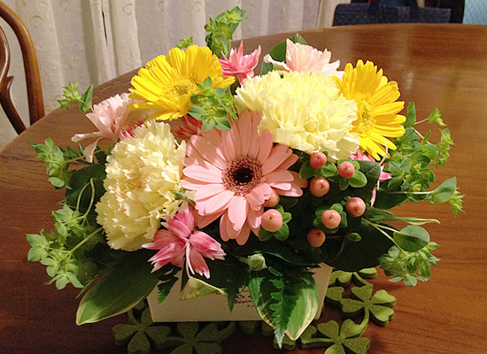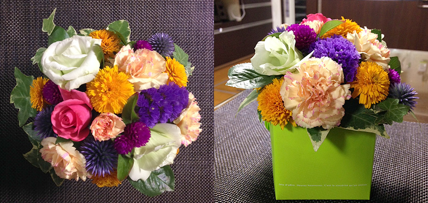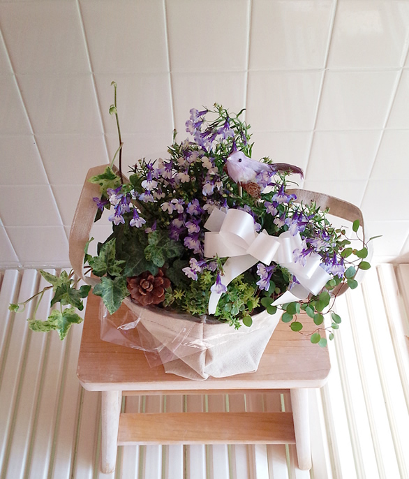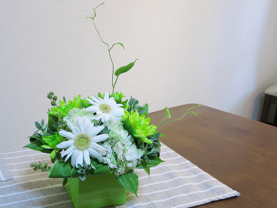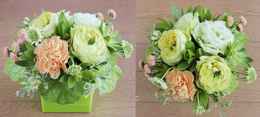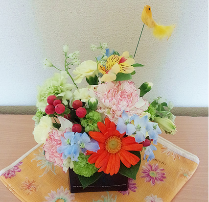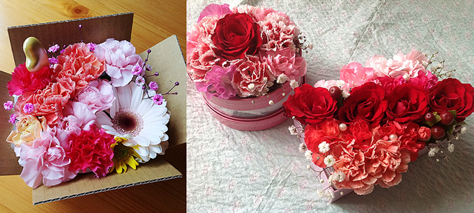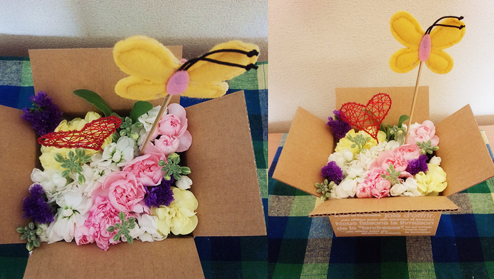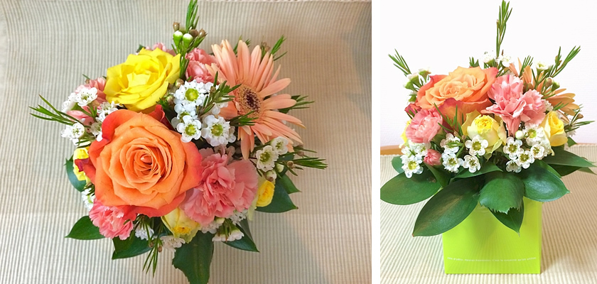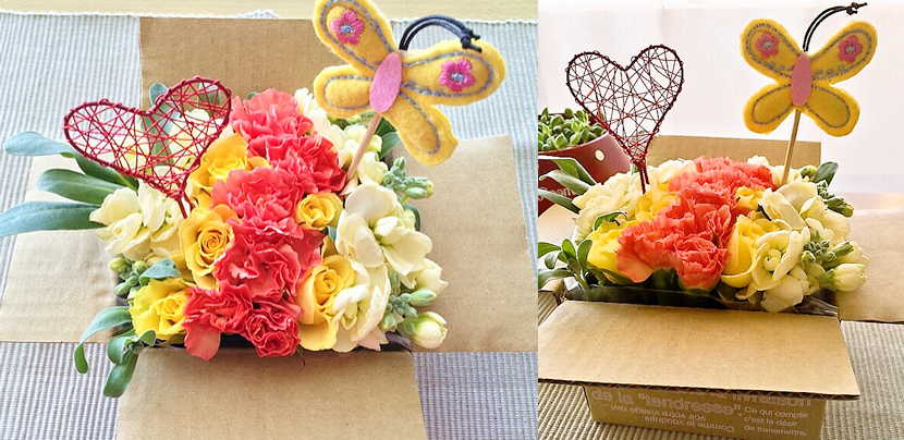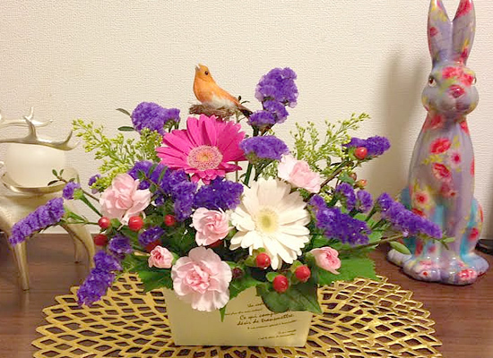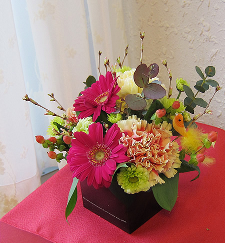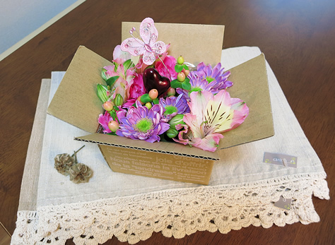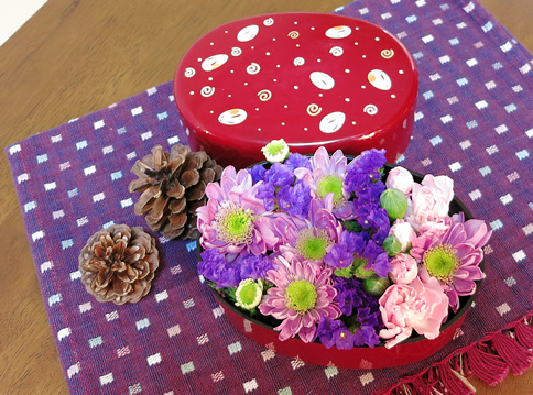 家にある箱や お弁当箱、重箱に敷き詰めるタイプのアレンジメントを飾ります。