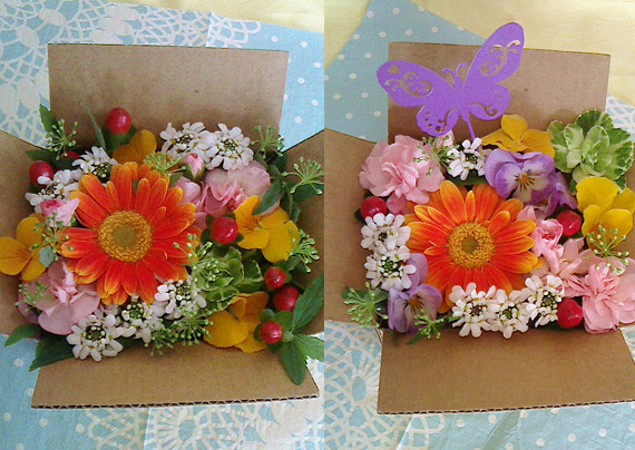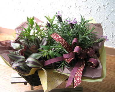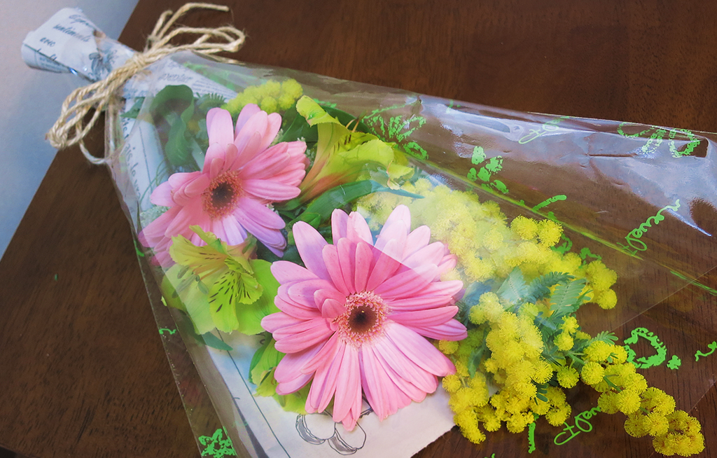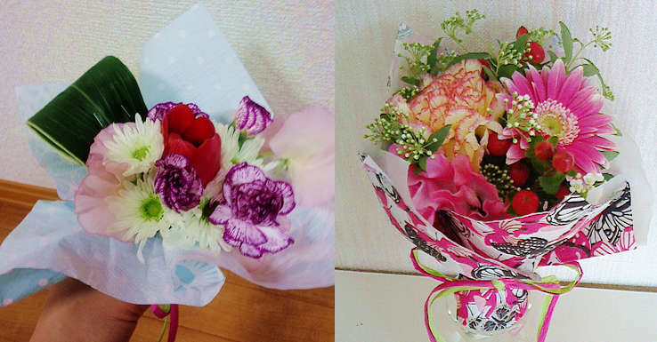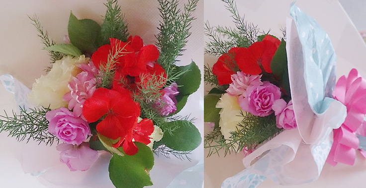 庭摘み花でも作ることができます。ラッピングも家にあるものとキッチン用品を使用。