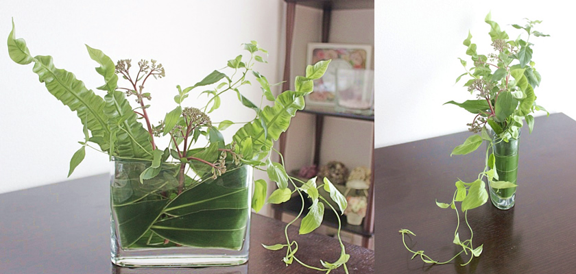 夏は暑くて花はすぐ傷んでしまうので、「葉っぱ」を飾ることを考えます!
